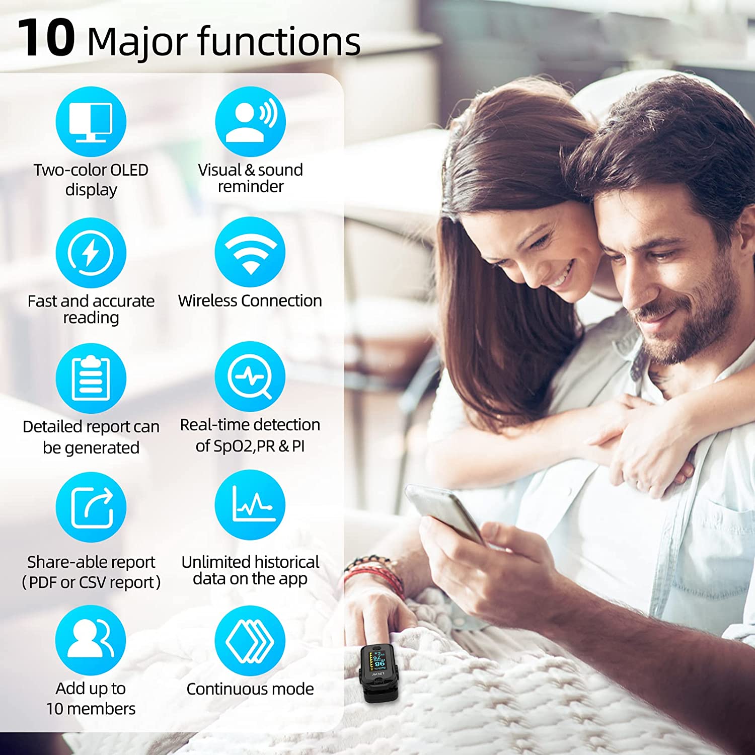 Bluetooth Pulse Oximeter Fingertip, OLED Display, Blood Oxygen Saturation Monitor (SpO2) and Pulse Rate, Perfusion Index with Alarm, APP for Smart Tracking, Batteries and Lanyard Included