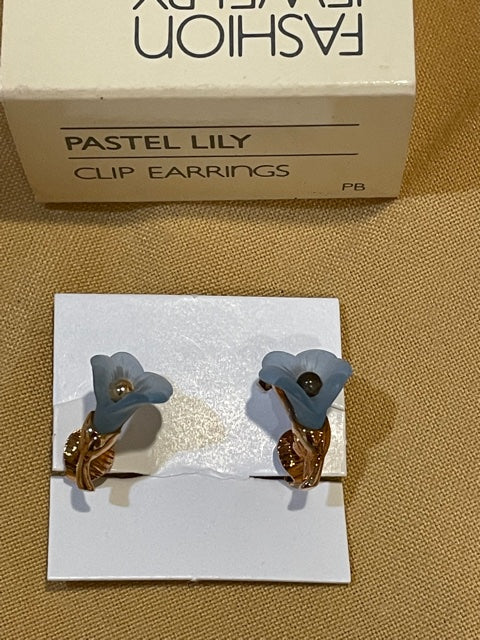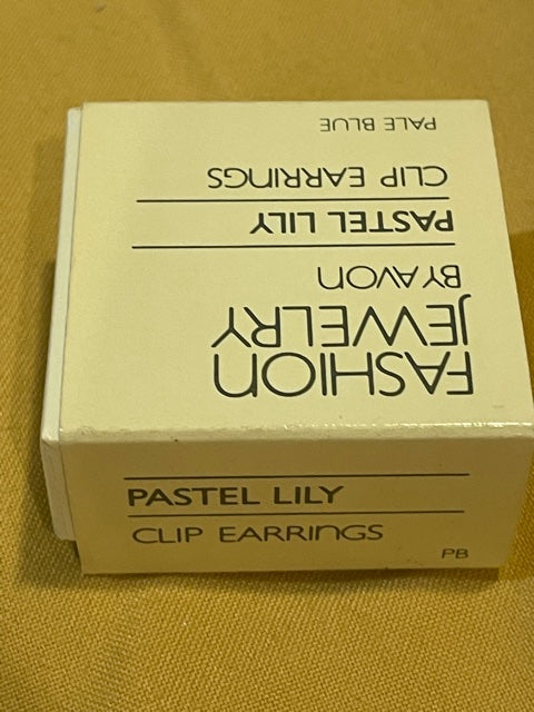Vintage AVON Pastel Lily Pale Blue High Quality Goldtone Clip Earrings NEW in Box 1983